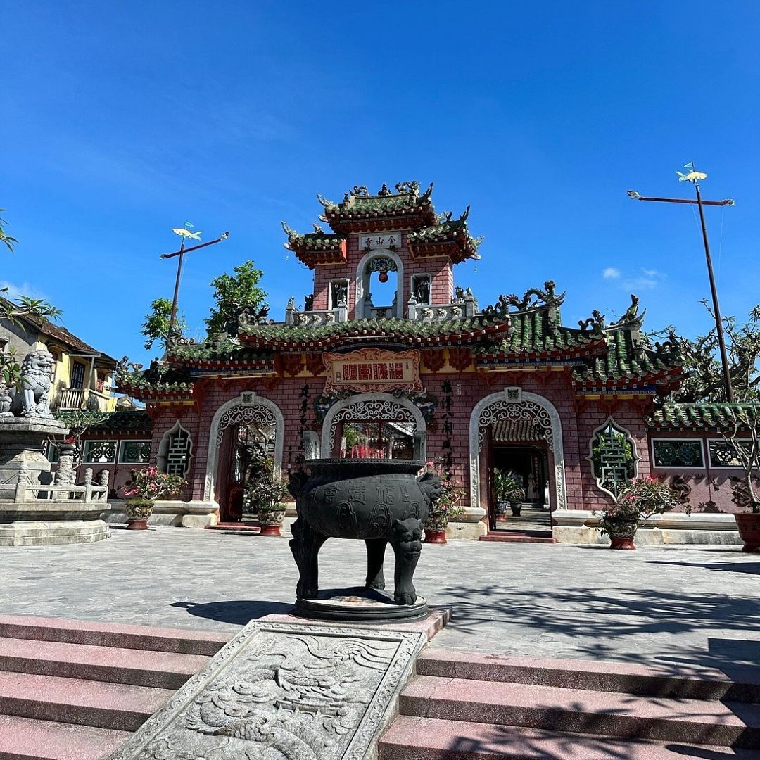- Templo Phuc Kien: Era originalmente um pagode de palha chamado Kim Son, construído pelos vietnamitas que viviam em Hoi An em 1692, destinado à adoração de Buda. Foi devastado por uma tempestade e em seu lugar o templo foi construído em 1697 por famílias da dinastia Ming de Fujian na China que se estabeleceram em Hoi An para aproveitar a prosperidade deste porto comercial que estava nas rotas marítimas de comércio entre China., Sudeste Asiático, Índia, Oriente Médio e também Europa. Famoso pela sua magnífica beleza, esplendor e majestade, é um espaço grandioso com uma arquitectura chinesa única e requintada. Foi dedicado à deusa do mar, Thien Hau, para atrair os bons gênios do mar. São duas figuras protetoras: Thien Ly Nhan, de rosto verde, cuja visão alcança mil lugares, e Thuan Phong Nhi, de rosto vermelho, cuja audição alcança mil lugares. Possui um majestoso pórtico rosa brilhante. Seu design e arquitetura contém muitos símbolos de animais e 3 altares em seu quintal.
