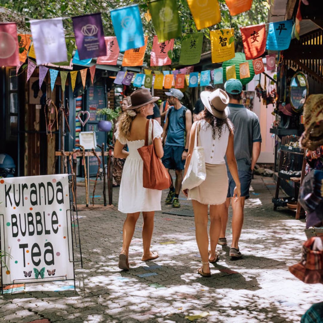 Cairns, no norte de Queensland, é uma cidade cosmopolita e vibrante, e um destino privilegiado para vela, mergulho e snorkeling. Suas águas tropicais abrigam a espetacular Grande Barreira de Corais, enquanto florestas tropicais exuberantes cobrem as áreas circundantes. Algumas maneiras de aproveitar ao máximo este paraíso costeiro incluem andar de bicicleta ao longo dos 14 km de praia de areia ou fazer rafting em corredeiras para ver as ruínas de Mission Beach. Outras atividades populares incluem visitar Cooktown para conhecer um pouco da sua história ou fazer uma caminhada panorâmica pelas fazendas, parando nos diversos mercados locais ao longo do caminho. No centro da cidade, visite o Parque Cultural Aborígine de Tiapukai para assistir a um espetáculo de música e dança sobre a história aborígine; ou relaxe no calçadão de Cairns para uma experiência gastronômica perfeita à beira-mar, acompanhada por um pôr do sol romântico.