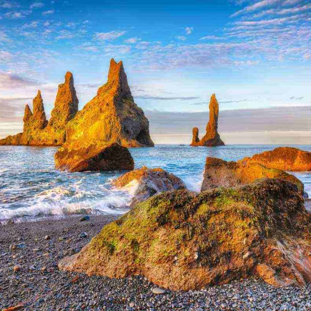 Uma das principais atrações de Vík é a praia de areia preta de Reynisfjara, considerada uma das mais belas do mundo. Com as suas imponentes colunas de basalto, grutas marinhas e as formações rochosas Reynisdrangar, a praia oferece uma paisagem dramática e fotogénica. Os visitantes podem passear pela areia vulcânica, observar papagaios-do-mar nas falésias próximas e maravilhar-se com as ondas do Atlântico batendo na costa.